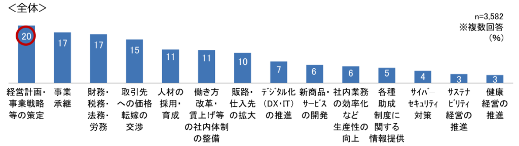 そもそもですが、経営計画・事業戦略を策定している中小企業は少ないと思います。また、策定する必要性について理解していない経営者も多い印象です。さらに、事業承継については、何から手をつけてよいかわからないケースが多く見られます。