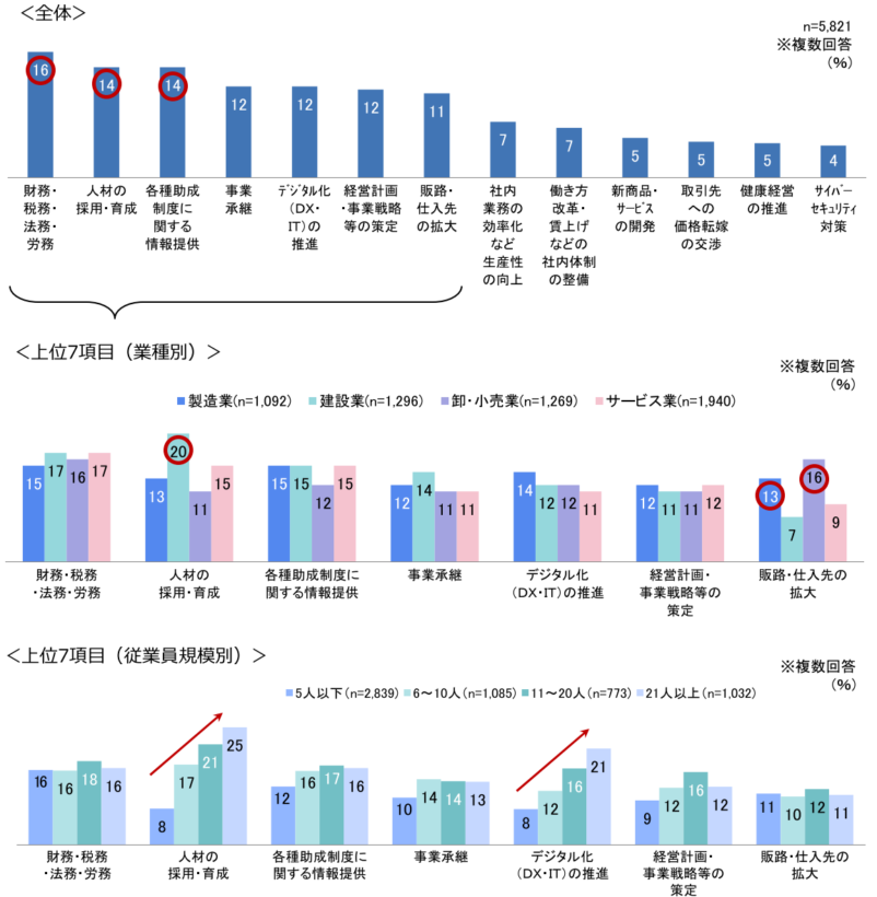 規模が大きくなるにつれて、「人の問題」「ITによる業務効率化」の支援を受けたい割合が増加しています。
