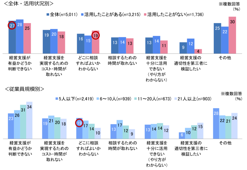 しかし一方で、「経営支援が有益かどうか判断できない」「経営支援を実現するためのコスト・時間がとれない」「どこにそうだんすればよいかわからない」といった理由から、依頼をためらっているケースも少なくありません。